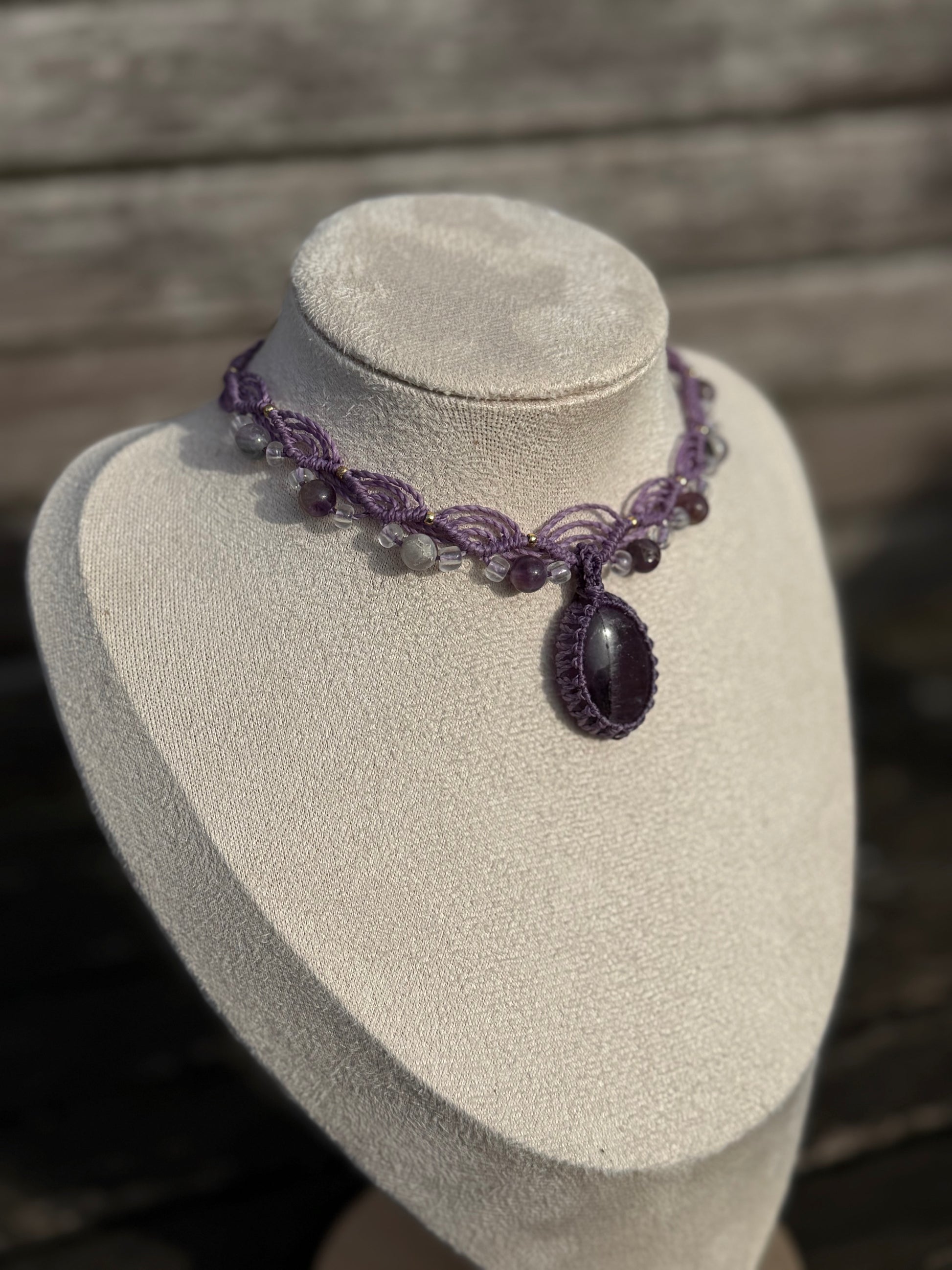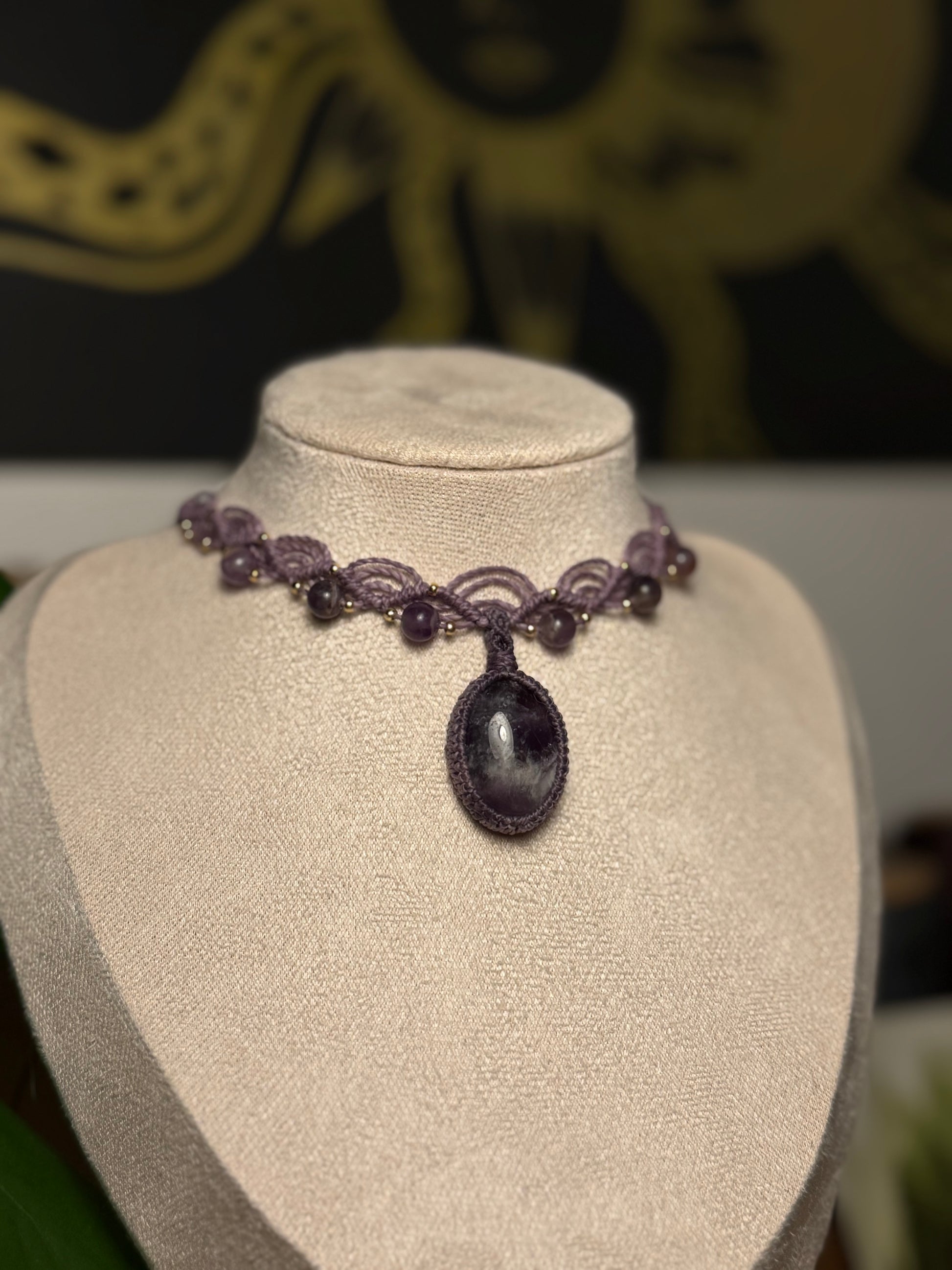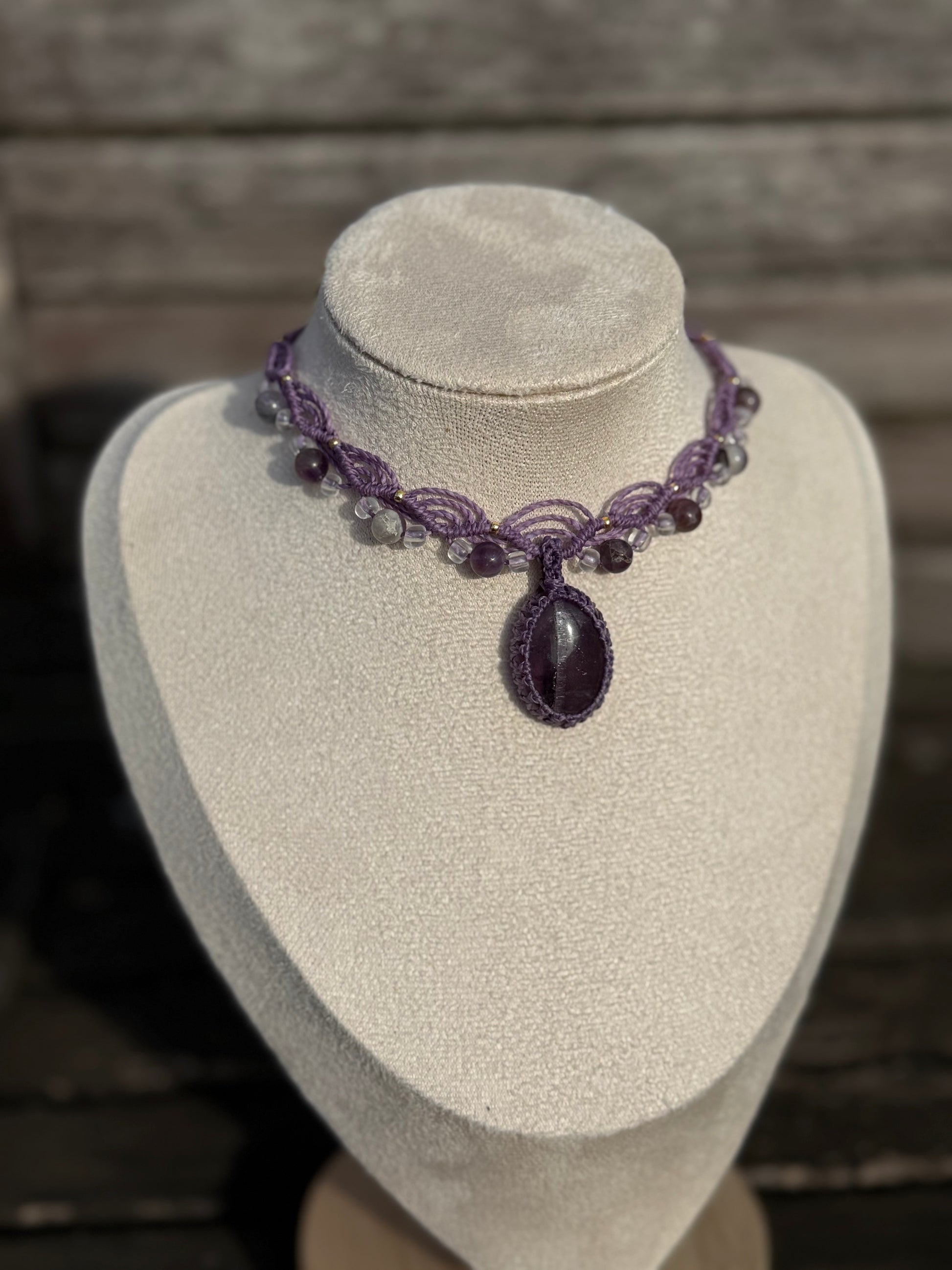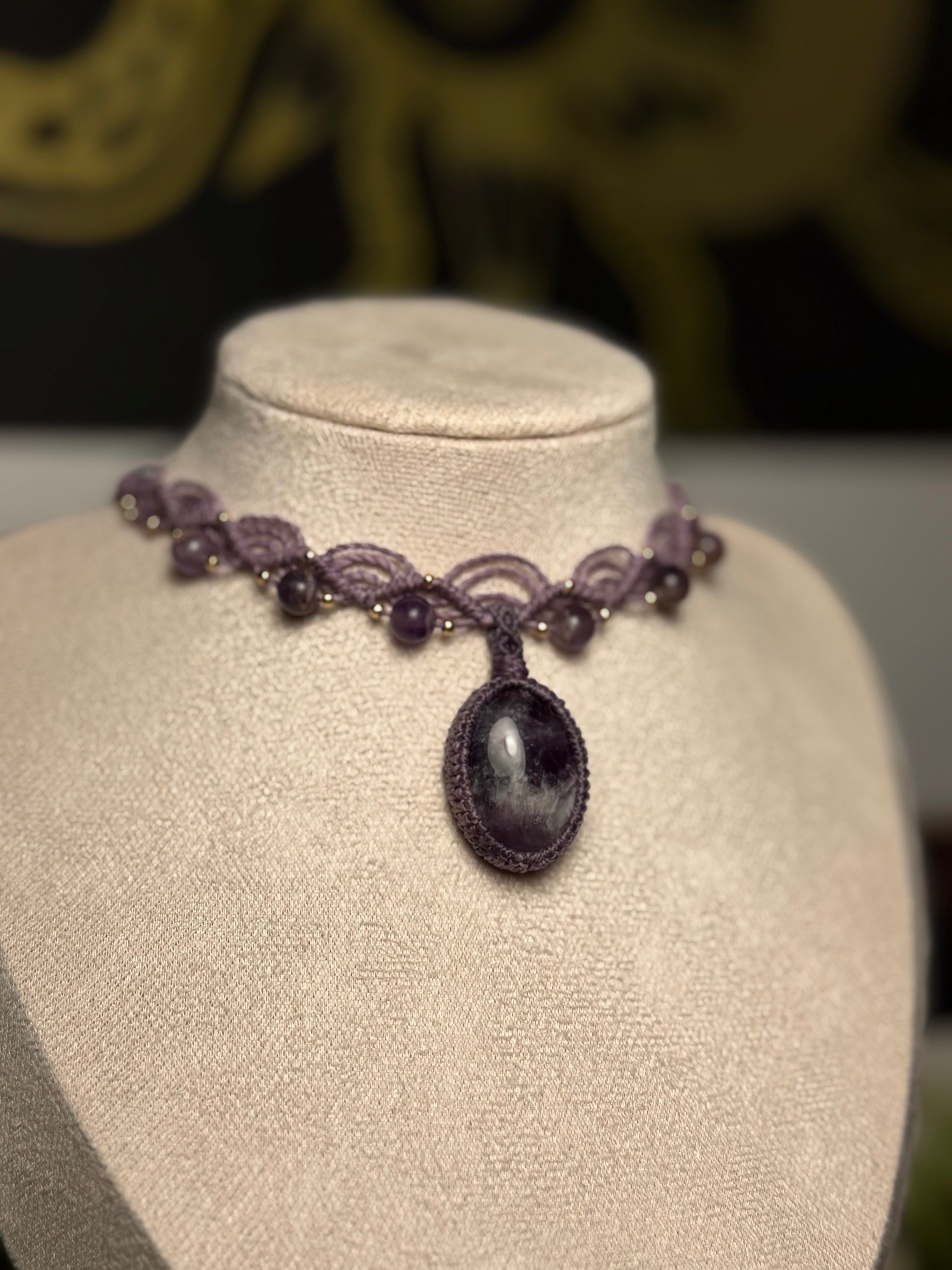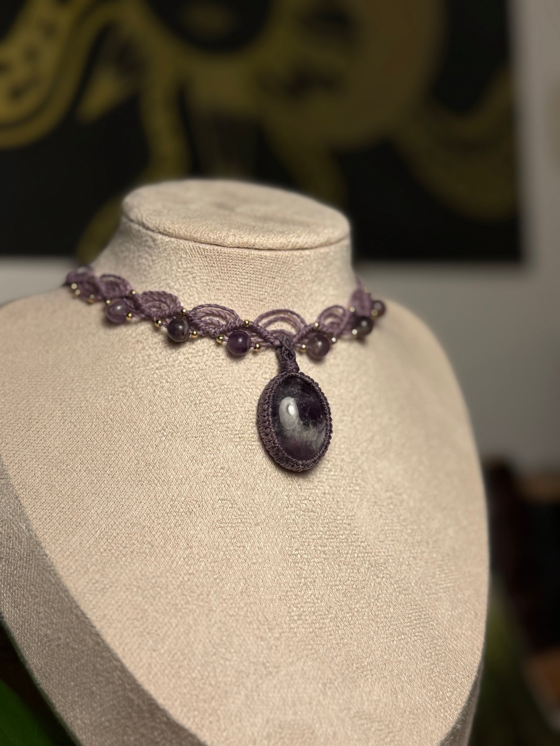 Diese elegante, handgefertigte Micro-Macramé Kette vereint feine Knüpfkunst mit der natürlichen Schönheit eines Amethysts. Der tiefviolette Edelstein bildet den Mittelpunkt des Schmuckstücks und wird von einem kunstvollen Muster aus gewachstem Garn sowie kleinen Amethyst-Perlen und goldfarbenen Akzenten umrahmt.