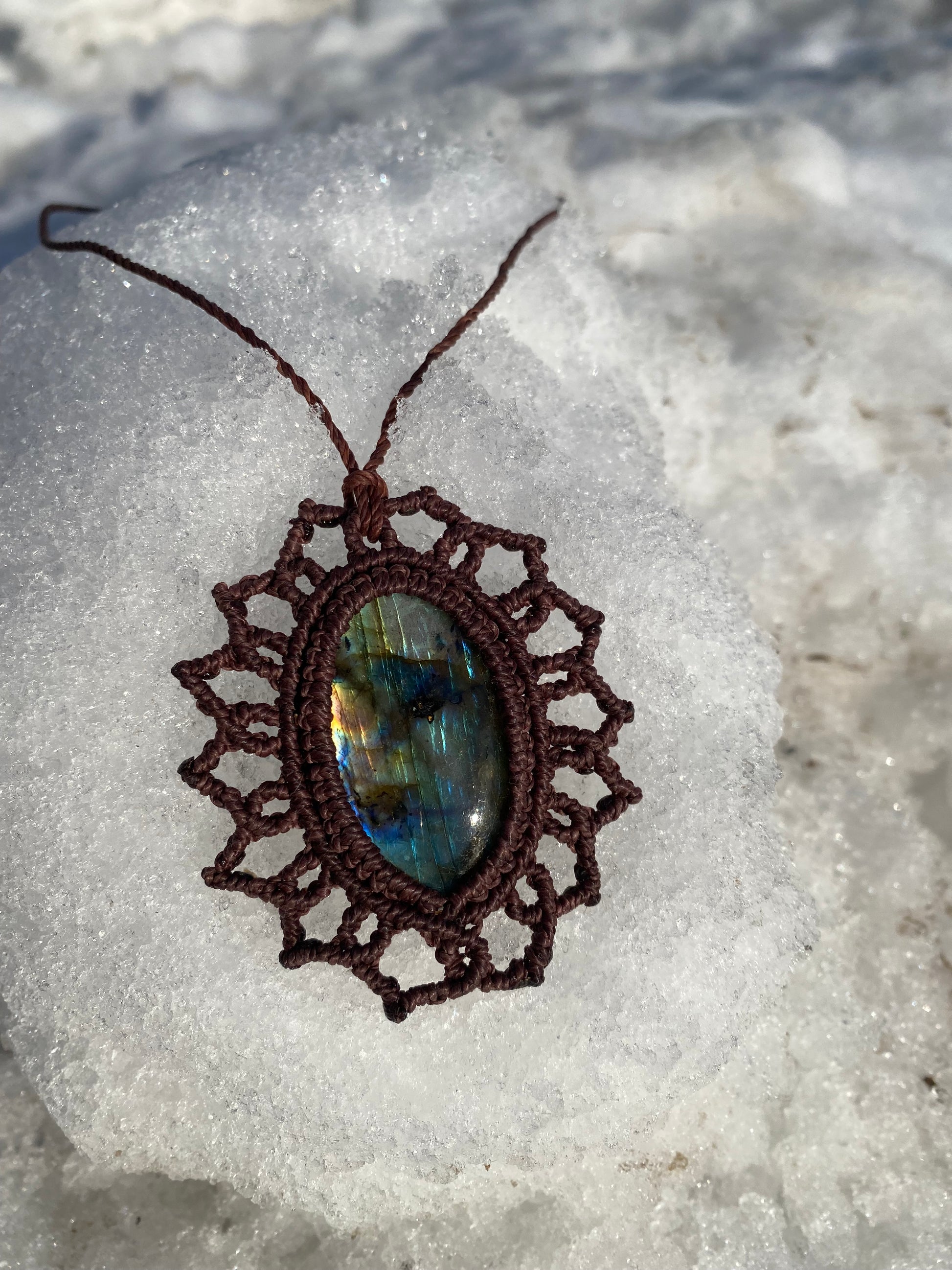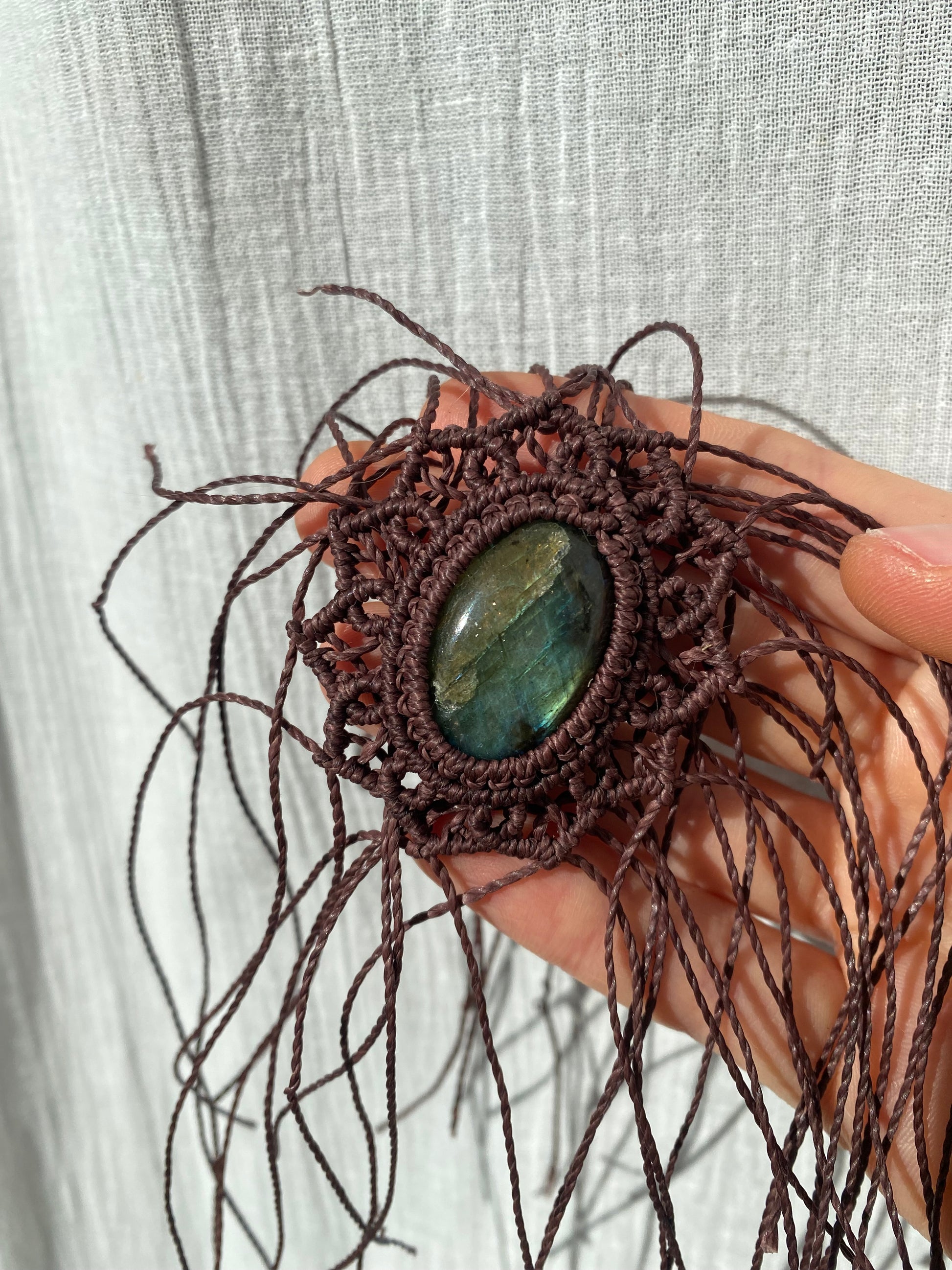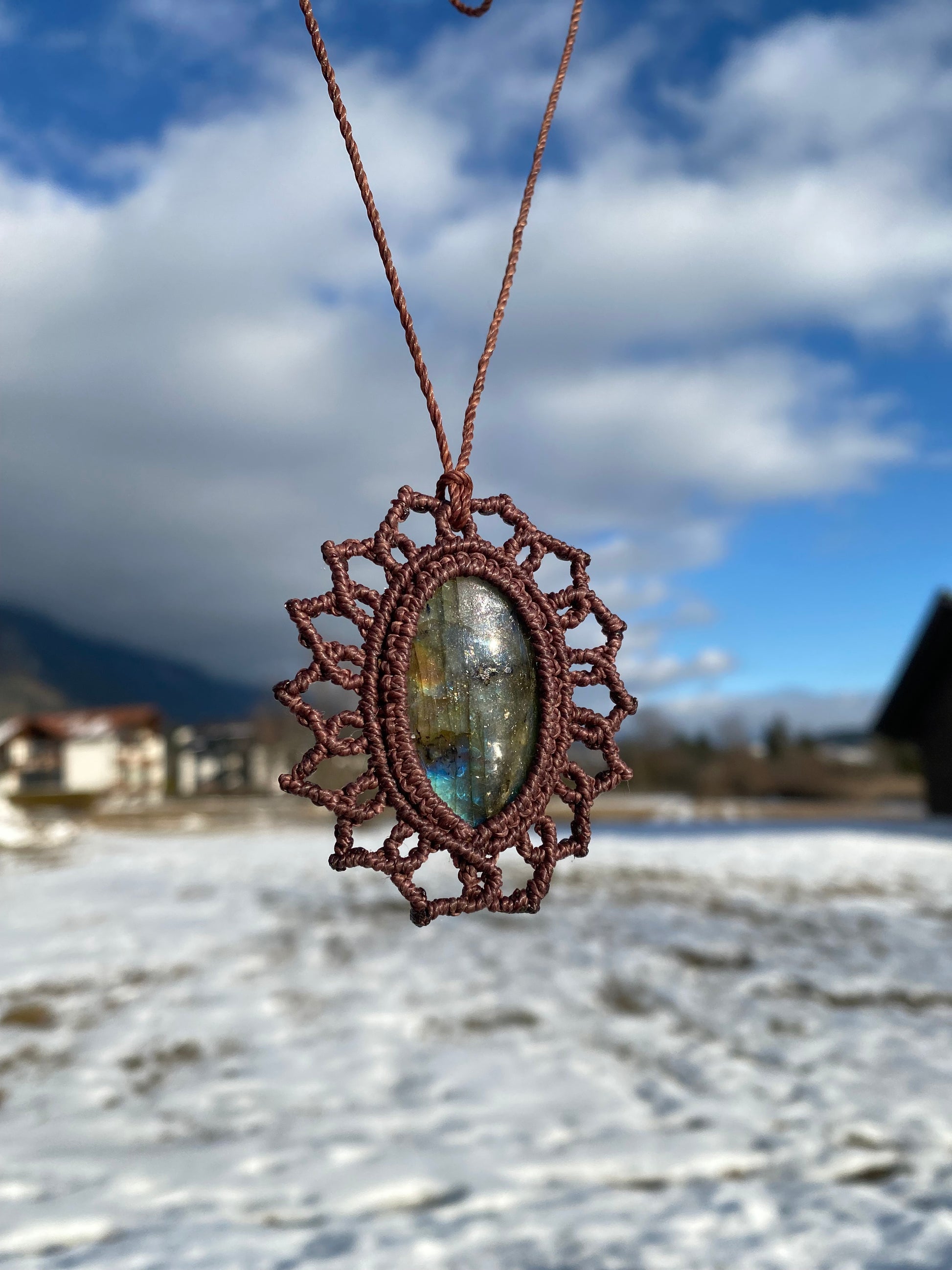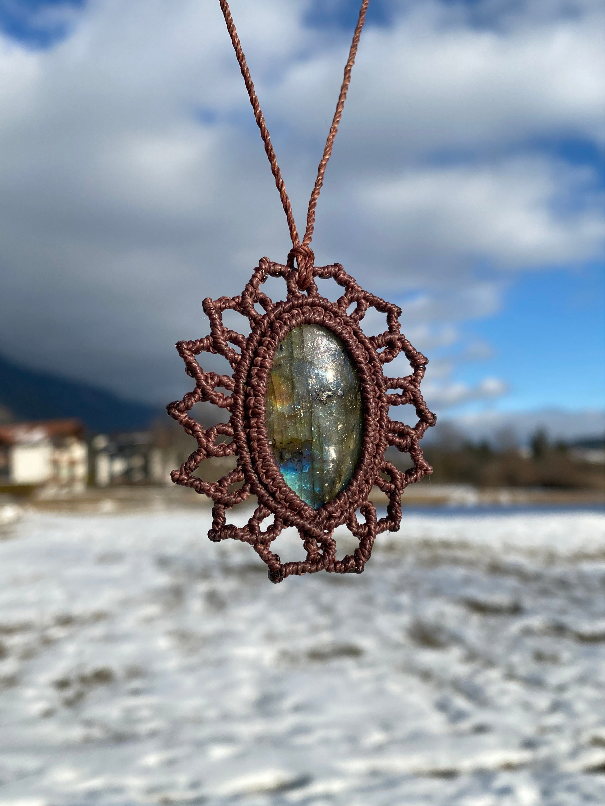 Handgeknüpfte Halskette im Sonnenmotiv mit schimmerndem Labradorit in Blau-Grün-Tönen. Die Sonne steht für Energie, Stärke & Neubeginn – ein kraftvolles Schmuckstück für jeden Tag.